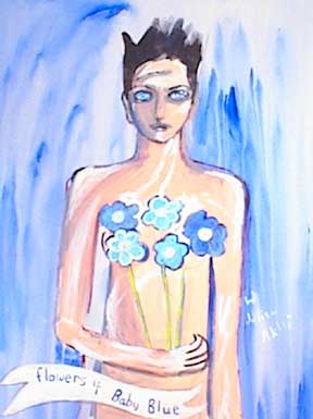 Painting, Flowers for baby blue, short haired female holding blue flowers on blue background. Acrylic on canvas.