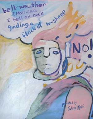 Bell-weather  Paul MacLean with bell on neck guiding a flock of white sheep. No!!