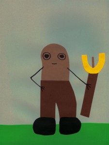 Wearing brown pants made of burlap and twine