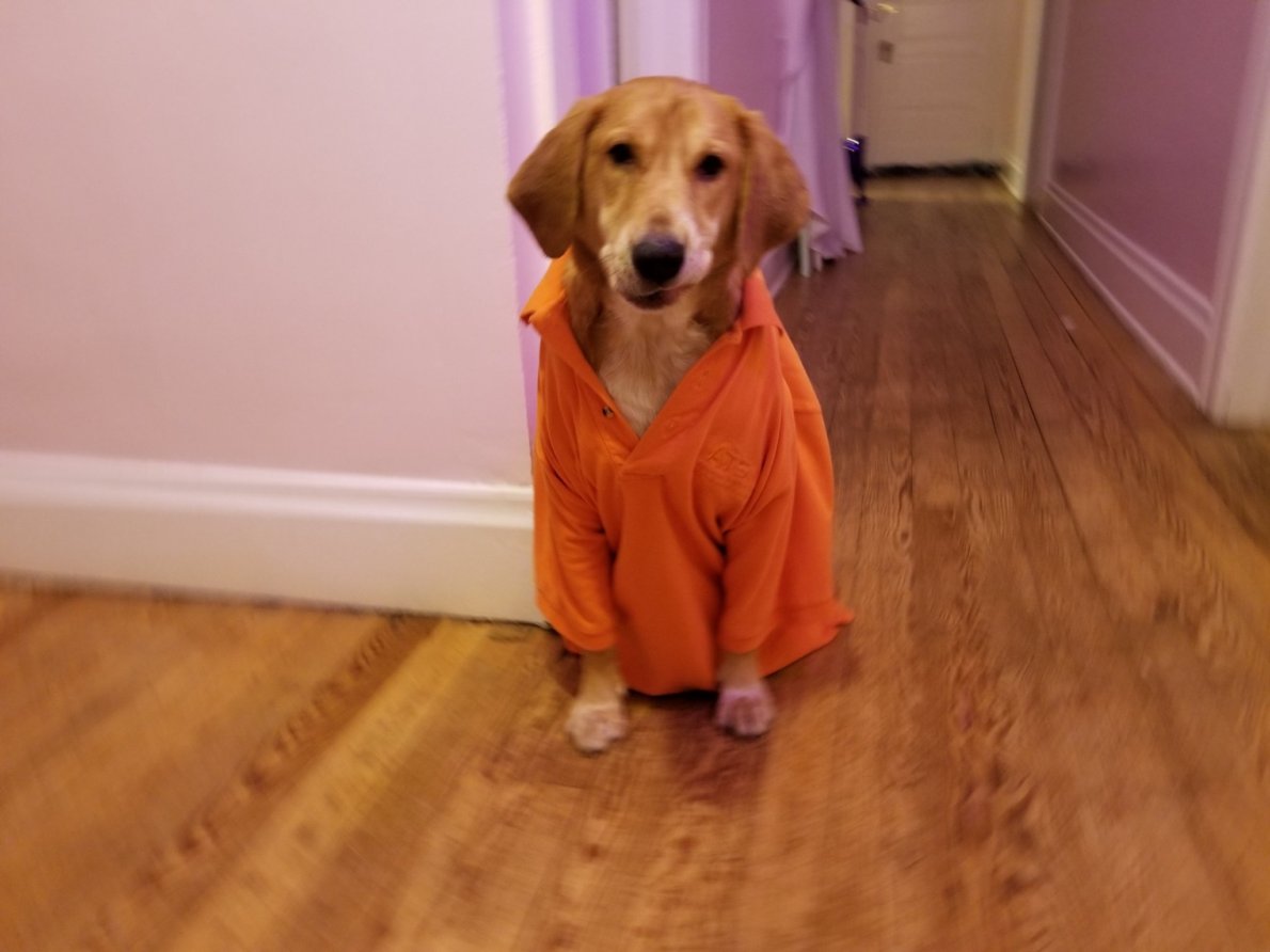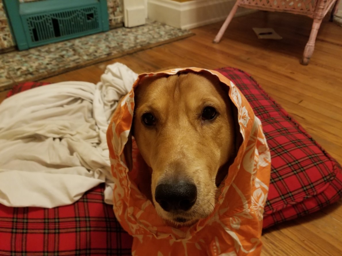 Slippers, wearing one of James’s shirts. I would like to dress her up in my clothes, but her torso is too large.